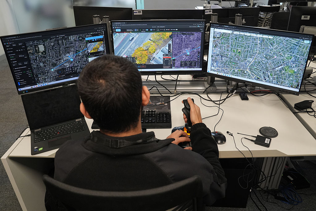 A police officer pilots a drone during a demonstration of the Metropolitan Police’s new Drone as First Responder (DFR) pilot programme, at Islington Police Station in north London, which uses drones dispatched to support police officers responding to emergency calls, and feeding intelligence to officers arriving at incidents. Picture date: Thursday October 23, 2025. (Photo by Lucy North/PA Images via Getty Images)
