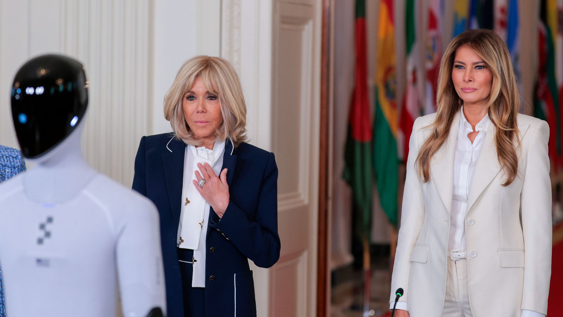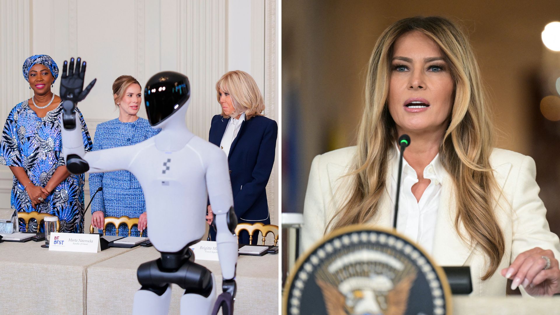 Melania Trump made a striking and unusual entrance at a high-profile artificial intelligence event she hosted alongside the spouses of several world leaders, notably including France's First Lady Brigitte Macron, immediately drawing attention both in the room and online. Arriving accompanied by a humanoid robot, the First Lady's appearance quickly went viral across social media platforms, where clips of the moment circulated widely. The event, centered on the future of education and emerging technologies, shifted from a diplomatic gathering to a viral spectacle within hours. While the setting gathered influential figures from across the world, it was the unexpected staging and visual symbolism that first captured public attention.