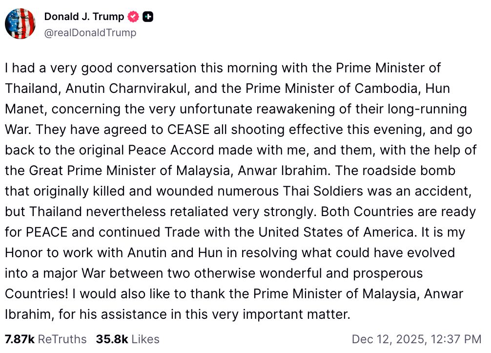 The original ceasefire between the two nations in July was indeed brokered by Malaysia and pushed through by pressure from Trump, who threatened to withhold trade privileges from both Thailand and Cambodia, unless the two nations agreed. The ceasefire was formalized in October, but Thailand suspended the agreement in November after Thai soldiers were wounded by landmines at the border. Thailand has reportedly stressed to Trump that the onus is on Cambodia to halt the conflict, but Thailand has a significantly more advanced military than Cambodia.