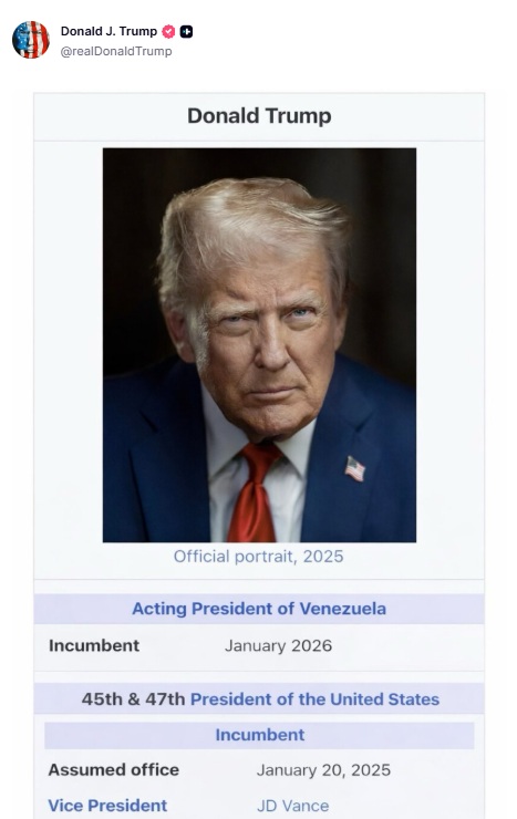 Against a backdrop of intense geopolitical tension over Venezuela's future, Donald Trump escalated the situation further with a Truth Social post in which he declared himself the «Acting President of Venezuela» alongside a picture of a fake Wikipedia page that labeled him «incumbent since January 2026», a digitally altered image that has drawn widespread indignation and criticism from world leaders and commentators who view the claim as provocative and illegitimate. In reality, Venezuela's vice president, Delcy Rodríguez, was sworn in as acting president on January 5 following the capture of Nicolás Maduro, a move ordered by the country's Supreme Court and rejected as illegitimate by the European Union and several governments. Trump's unusual claim, widely seen as a controversial gesture rather than any legally grounded authority, has intensified debate over U.S. involvement in Venezuela's crisis and sparked demonstrations around the world, with protesters condemning what they describe as an unlawful violation of Venezuelan sovereignty and a dangerous escalation of international tensions.